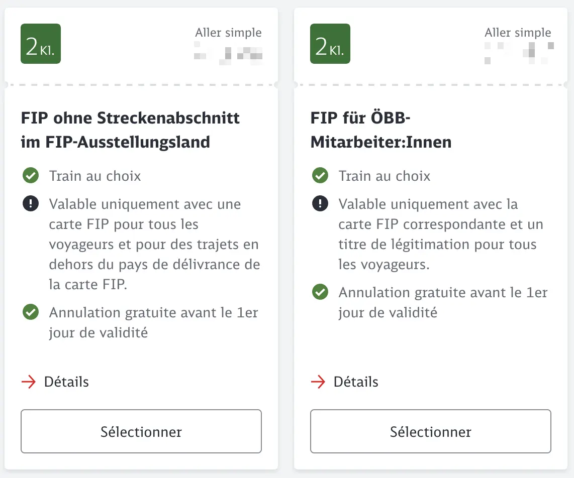 Les employés de la Deutsche Bahn peuvent acheter en ligne des Billets FIP 50 pour des trajets au départ de l’Allemagne vers les pays voisins. Ces billets sont disponibles via le portail DB Reisemarkt > Bahnangebote > Ausland > FIP-Angebot. Le Billet FIP 50 est uniquement valable pour la partie étrangère du trajet. C’est un point important pour les employés DB, car les Billets FIP 50 ne sont pas valables dans leur propre pays. Un billet supplémentaire est donc nécessaire pour le trajet intérieur jusqu’au point frontalier.